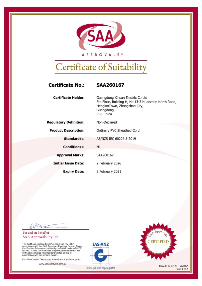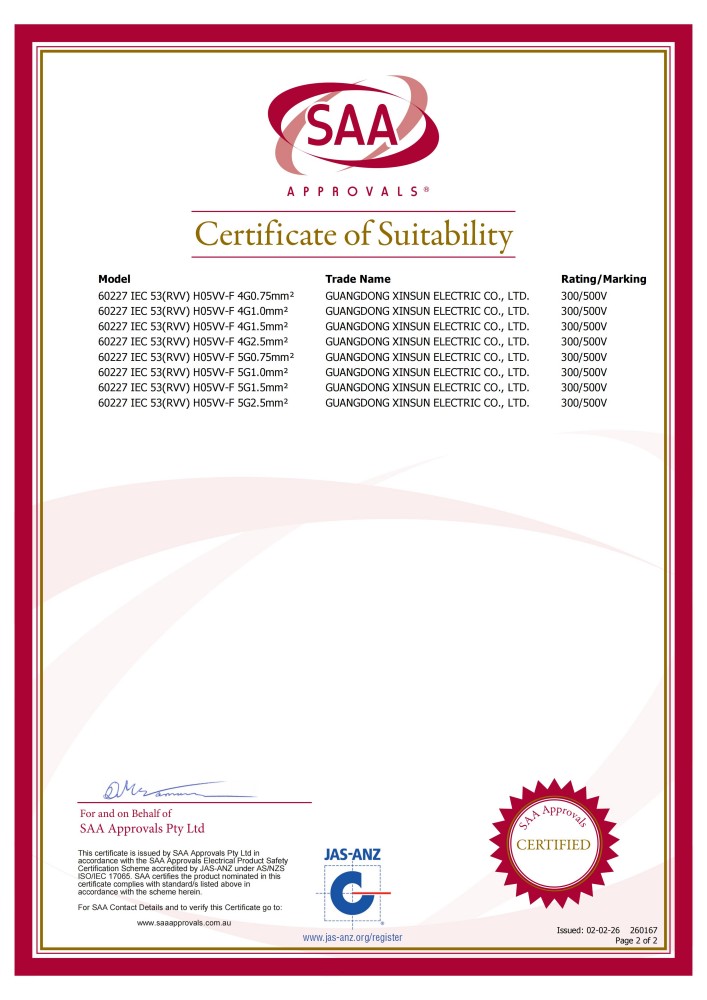 SAA PVC线H05系列 4-5芯 证书